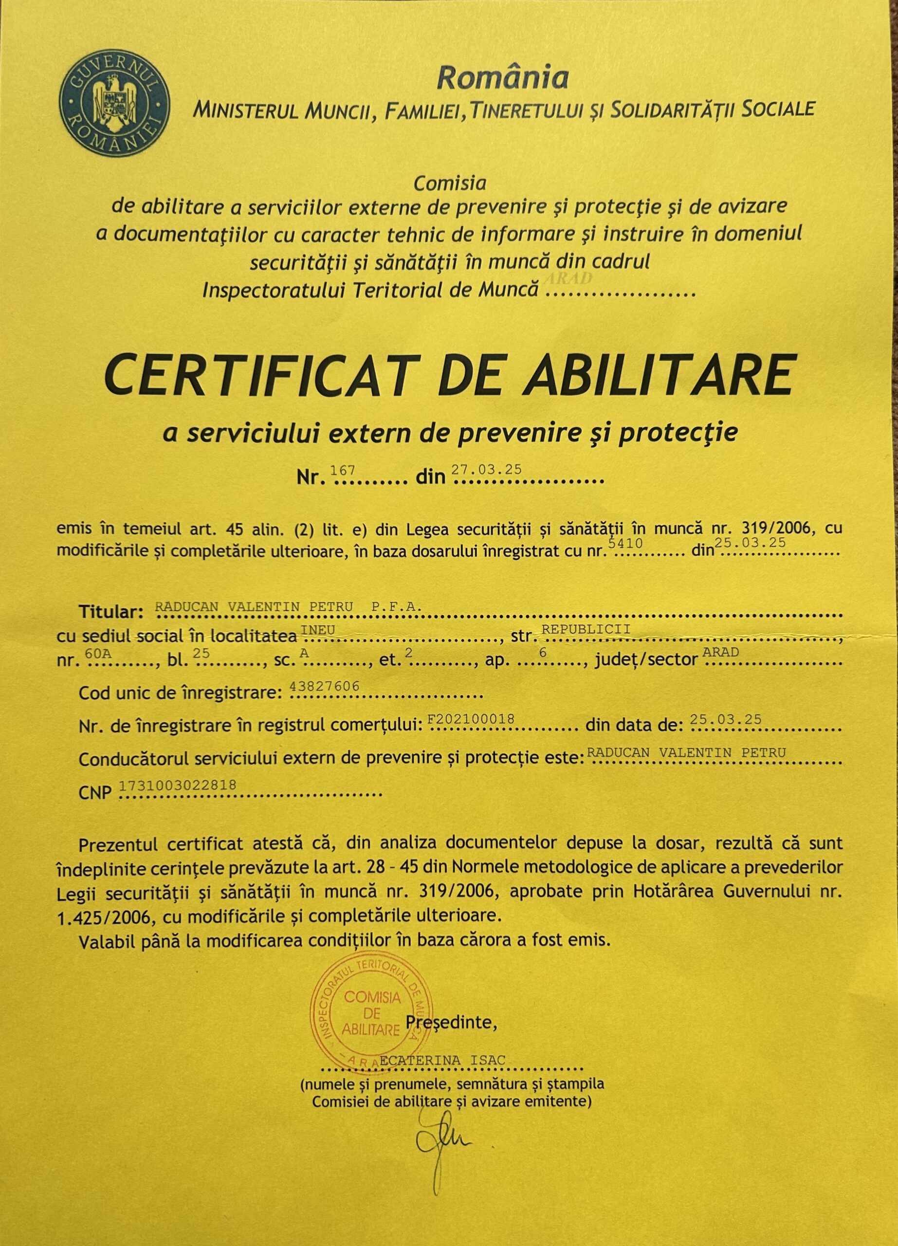 Serviciu extern de prevenire și protecție abilitat cu Certificat de abilitare nr. 167/27.03.2025 și